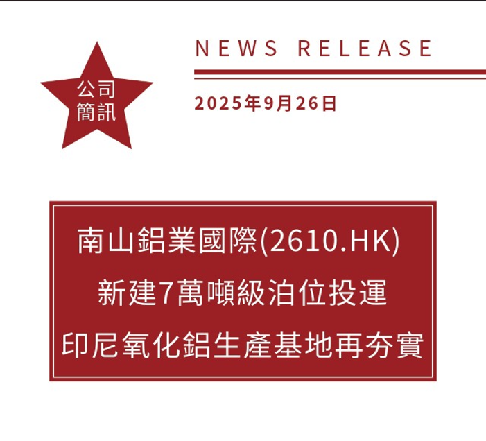 南山鋁業國際(2610.HK)宣佈擬進行先舊後新配售:募集資金約20億港元,支持印尼電解鋁項目建設